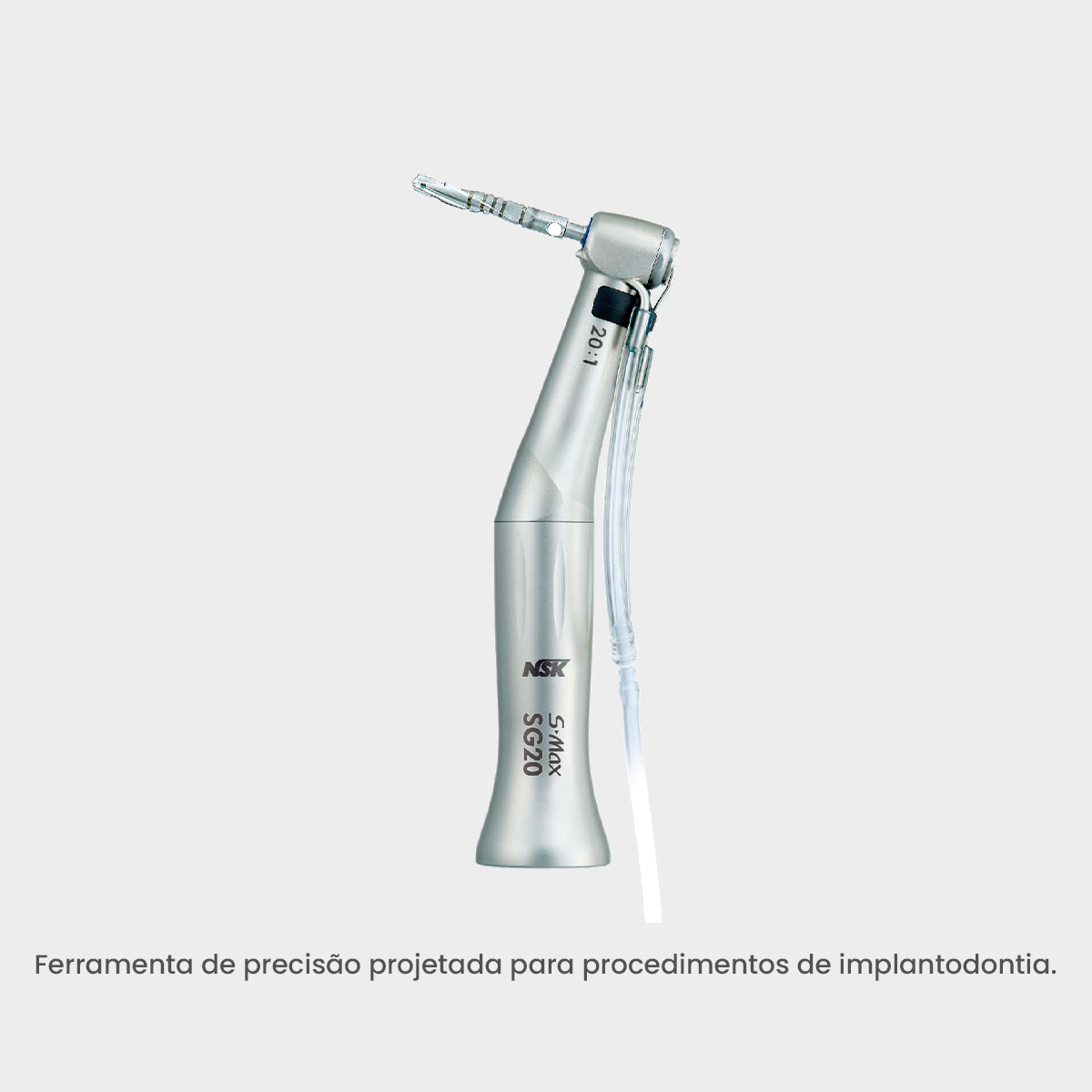 O Contra Ângulo para Implante 20:1 S-Max SG20 da NSK é uma ferramenta de precisão projetada para procedimentos de implantodontia. Com uma redução de 20:1, este contra-ângulo oferece controle excepcional e torque elevado, permitindo uma colocação de implantes segura e eficiente. Fabricado em aço inoxidável e equipado com irrigação interna e externa, garante uma refrigeração adequada durante o uso.