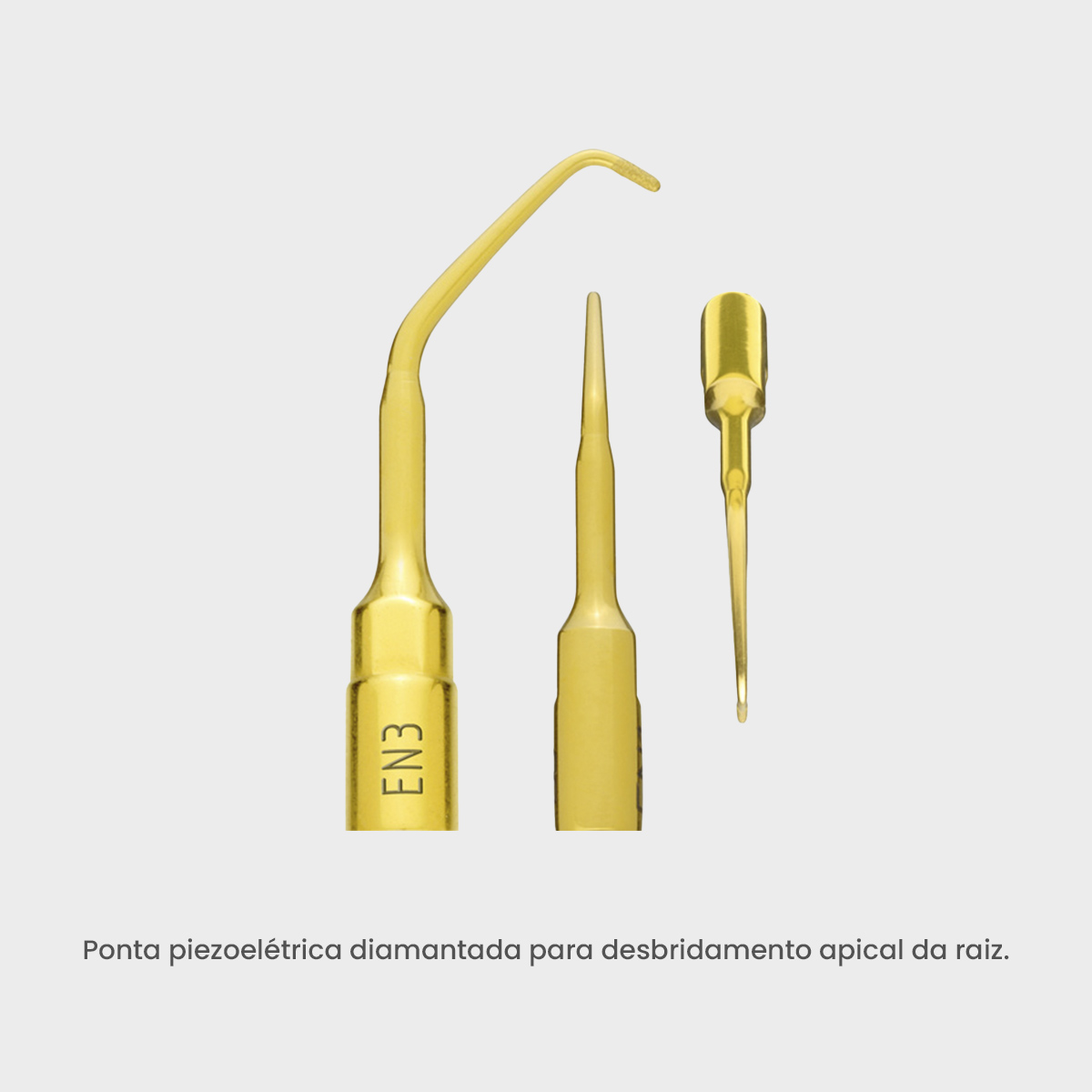 A ponta cirúrgica ultrassônica Mectron EN3 é diamantada e possui debridador endo apical de 2,2mm. Além disso, este insert cirúrgico tem revestimento de Nitreto de Titânio por isso, esses equipamentos possuem maior durabilidade.