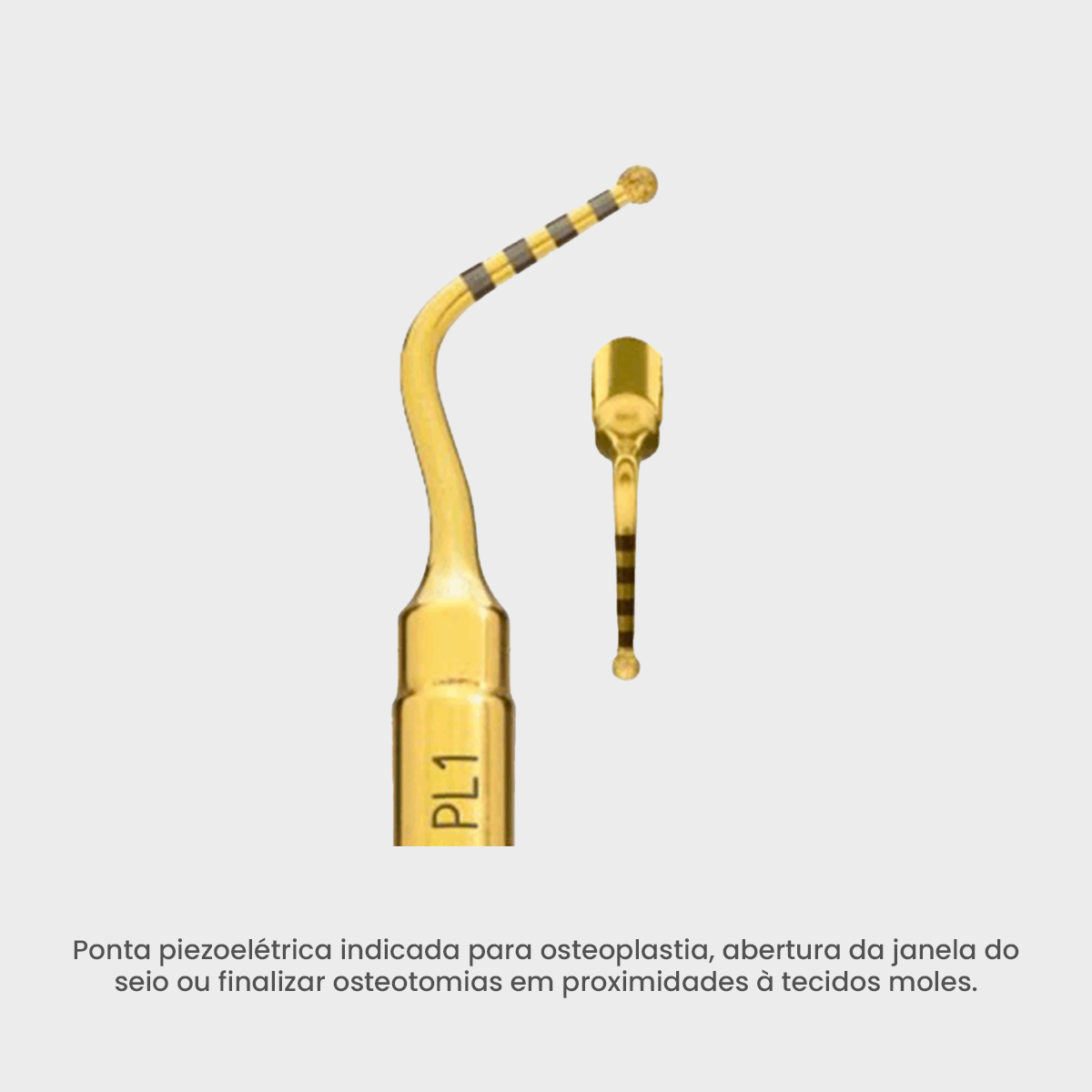 Esta ponta cirúrgica é revestida em Nitreto de Titânio. Devido a isso este equipamento é mais resistente e durável. Além disso, a ponta cirúrgica PL1, é uma excelente opção para aproximação ao piso sinal e retirada de janela óssea, pois realiza os procedimentos de maneira minimamente invasiva.