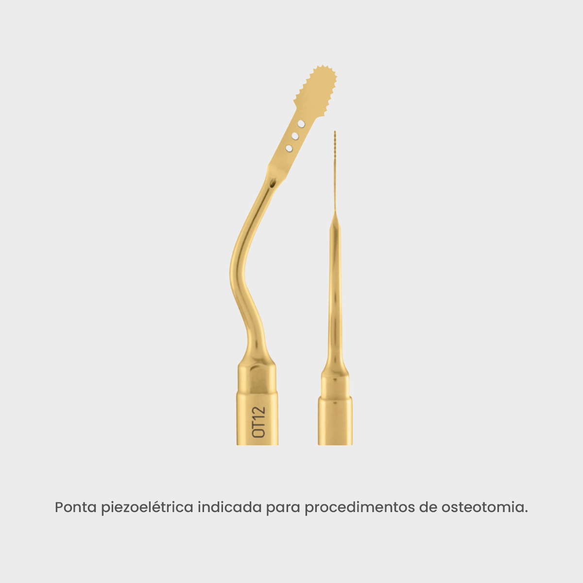 A ponta piezoelétrica OT12 é indicada para procedimentos de osteotomia. Cortando tecido duro sem cortar tecido mole.